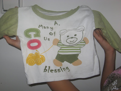 After a long day of intense searching for cheap (and cute) clothes during our Shanghai trip in October, Tiffany found an old woman selling baby clothes, nunchucks, and cigarette lighters, a natural combination. Acting in desperation near closing time, Tiffany settled for an outfit with a ridiculous bear who had a squeaker toy hidden under the snout and some nonsense English (this is how low we were pummeled). Revealing our inexperience through hesitation, we caved in and bought the silly outfit (after demanding a nunchuck demonstration-- priceless coming from an elderly woman), but only because she had the clothes bagged up and cutely wedged into Didi's chubby little wrist rolls .